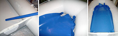 Друг пошел дальше и катал на нем ребятишек и женщин как на водных лыжах, с умеренной скоростью и осторожностью конечно. Я человек аккуратный, друзья тоже, и то, что нам нравится – бережем, поэтому на всякий случай (в первую очередь, что бы песок и камушки не попадали между AirDeck и баллонами) постелили «коврики» из линолеума тонкого, сделанного корытцем (бока надрезали, после эксплуатации сворачивается в рулончик диаметром 5 см).