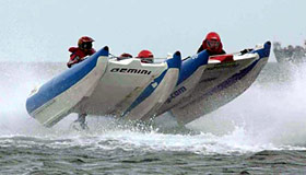 Наконец-то пришло время и самим «Zapcat»’ам попробовать воду для первой практики. Хотя условия на воде были почти комнатными и, волнение не превышало 1-2 балла, тренировочные заезды не обошлись без происшествий! Катамаран с бортовым номером «JC 32» практически у самого старта, как норовистый конь, сбросил обоих, и пилота и штурмана команды «English Heritage Buildings», в воду, а упрямый «Zapcat» продолжил движение по трассе свободный, как ветер!
