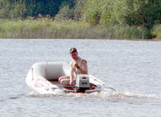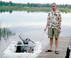 На надувной лодке установлен подвесной двигатель «Нептун-23». Винт штатный (красный) — диаметр / шаг — 230 / 280. Скорость движения (весьма приблизительно) — порядка 35км/ч с 3 людьми на борту.