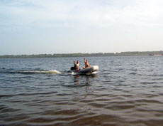 Пришлось мне качать его автомобильным компрессором – довольно нудная операция, т.к. автомобильный насос имеет небольшую подачу воздуха, да и шланг у него малого диаметра. Из-за того, что пол не надувался, то моя лодка на ходу как бы переваливалась через волны, изгибая при этом дно – довольно неприятное ощущение.