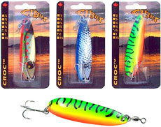 Первыми товарами, из выставленных на тестирование и заинтересовавших меня, стали блесны канадской фирмы Гиббс. Честно говоря, сейчас я уже и не помню, какой по номеру из предлагаемых наборов меня заинтересовал. Но, взял я тот, который содержал в себе три тяжелых блесны серии Croc, весом от 17 до 24 гр. Все три приманки имели различную окраску: кислотная FT, металлик с синей спиной HCBS и медная с точками, под лосося.