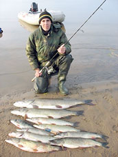 Что ж, попробуем “повозить” её дальше! Найдя по эхолоту подводное плато с переходом с 4-х метров глубины на 3-и, дорожкой медленно проходим по нему… Поклевка на один из спиннингов. Тут же, через мгновение, поклевка на второй, напарника.