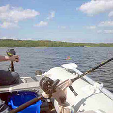 Погода стояла солнечная, безветренная. Новый Tohatsu 18 тащил мою ПВХ лодку 3,7 м вместе с планерами на холостых оборотах вдоль изрезанного берега с тростником очень уверенно. Поглядывая на планер, можно нормально передвигаться, аккуратно маневрируя мотором. Все шло хорошо. Пару раз хапнули шнурки, но из-за своего донерестового размера были отправлены восвояси.