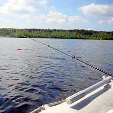 Небольшой боковой Юго-Западный ветер, с волнением на поверхности, но для проведения испытаний даже лучше. Электромотор, поскольку под бензиновым еще движение запрещено, два удилища – одно троллинговое с мультипликатором и леской 0,5 мм, другой ультралайт с «мясорубкой» и шнуром Unitika PE PS 0,12 мм. Оба в подставках Scotty для удобства. И два минипланера, один полученный на экспертизу Walleye, другой докупленный для полного комплекта – ТХ-22, универсальный с флажком. Приманки поставил длиной 12 см с сильной игрой на ТХ-22 и небольшой на Walleye.