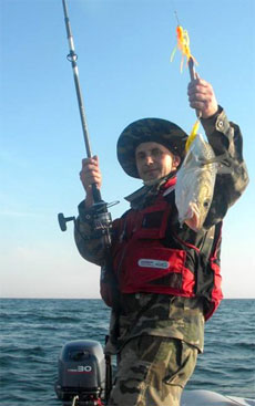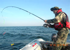 Лодка показала хорошую курсовую устойчивость, выход на глиссер вообще никак не ощущался, то есть начинаешь движение, чуть добавляешь газу, и уже глиссируешь. Никакого тебе задирания носа, и это даже не зависит от того, где находится пассажир, в носу или в корме. Вторую рыбалку можно было отнести к настоящим испытаниям: море скучать не давало. Оторвавшись от земли, начали движение против северного ветра, и тут сразу стало понятно, для чего такой развитый киль.