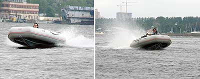 Сказано – сделано. Немного поработав над гидродинамикой днища, мы дополнительно установили систему Tween Kell, разработанную для серии Wave Line и, несколько изменили компоновку транца судна. В результате, мы не только уровняли шансы в скорости, но и получили отменные ходовые характеристики (см. фото ниже) нашего Heavy Duty на короткой волне с высотой 0,3-0,5 м. Это и стало вторым конструктивным отличием модельного ряда 2008 года. Третье отличие – алюминиевый составной пайол в базовой комплектации.