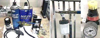 На фото показаны: электрокомпрессор с манометром и аэрограф, к которому подсоединена емкость с краской. Давление воздуха, при котором можно довольно качественно заниматься аэрографией на некрупных поверхностях, составляет 10-15 psi.