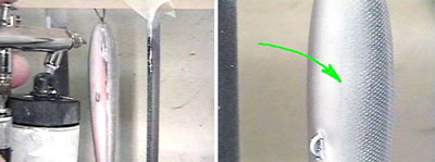 Как уже говорилось ранее, удобнее окрашивать воблер, подвешенный вертикально. Плавно двигайте кистью, стараясь делать проходы по всей длине приманки. Начните с более узкой и направленной струи аэрографа, а заканчивайте более широким конусом рассеивания краски.