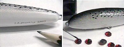После того, как воблер раскрашен, настало время подарить ему «глаза». В принципе, их можно нарисовать тем же трафаретным методом после окончательного финишного покрытия воблера эпоксидкой, однако, можно оснастить приманку объемными реалистичными глазами подобными тем, что ставит на свои приманки фирма "MirrOlure".