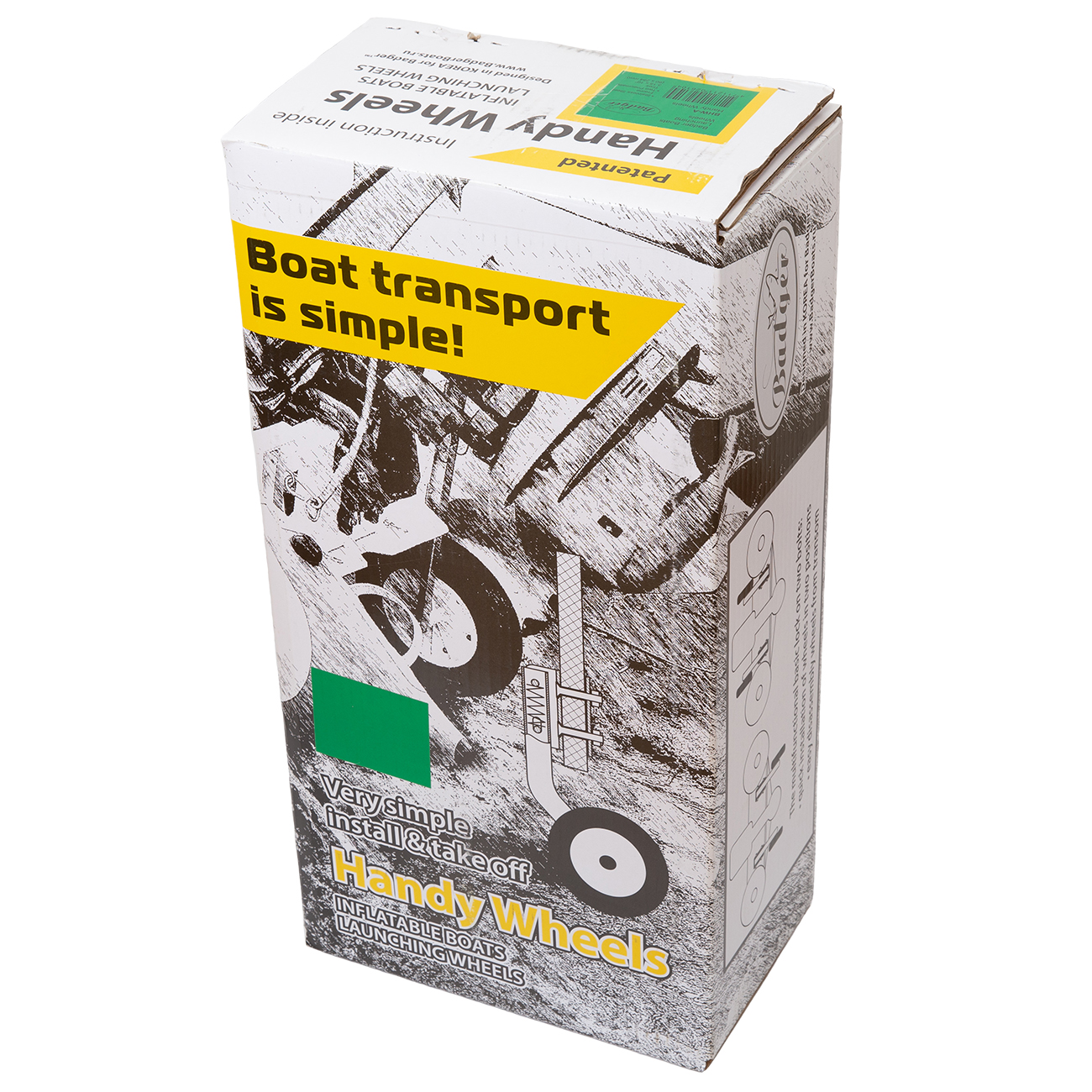Комплект съёмных колёс Handy Wheels для установки на транец лодки ПВХ Air Line Badger, включает две стойки из нержавеющей стали, оснащённые одинарными пневматическими колёсами и замками, а также П-образные накладки для установки на транец, болты для их крепления и инструкцию.