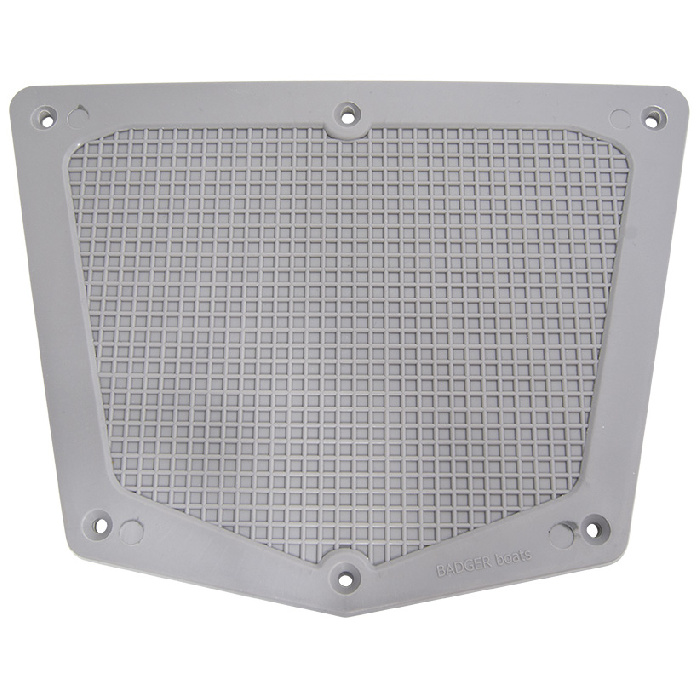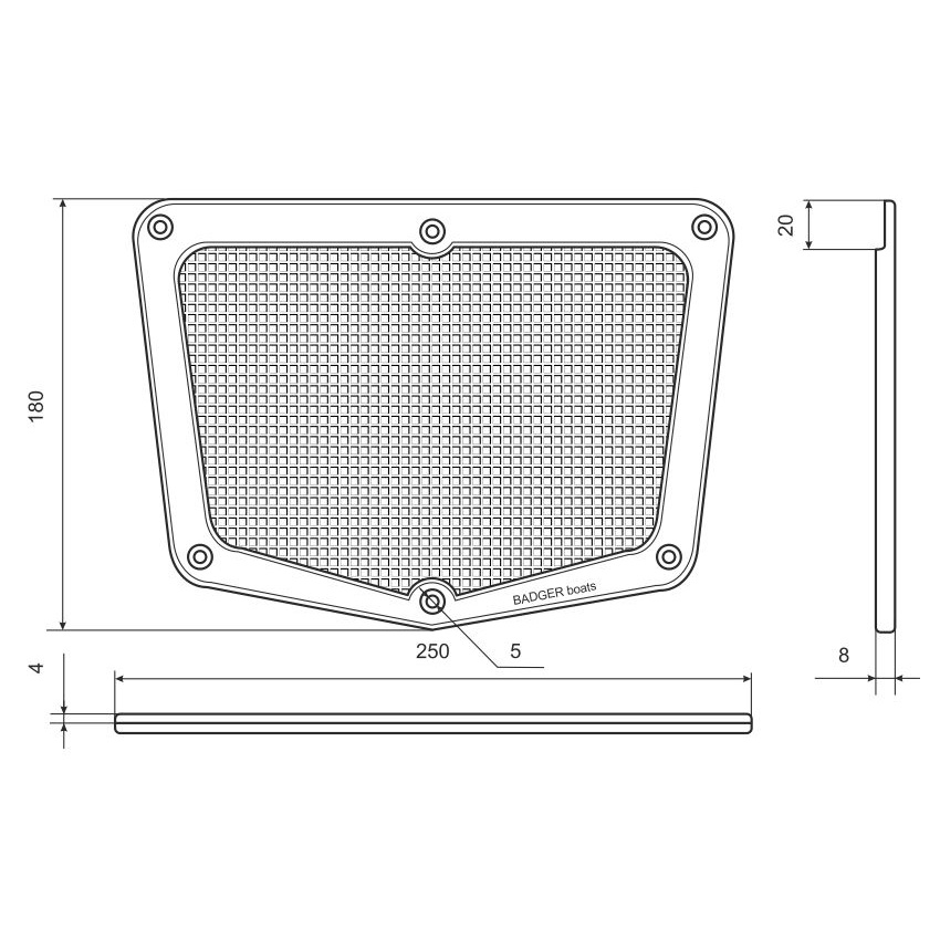 Изготовлена из пластика и имеет рифленую наружную поверхность. В верхней части пластины находится проточка для компенсации толщины П образгого профиля на торце транца, позволяющая пластине плотно прилегать к поверхности транца. Крепится на наружную часть транца с целью защиты его поверхности от элементов крепления лодочного мотора.