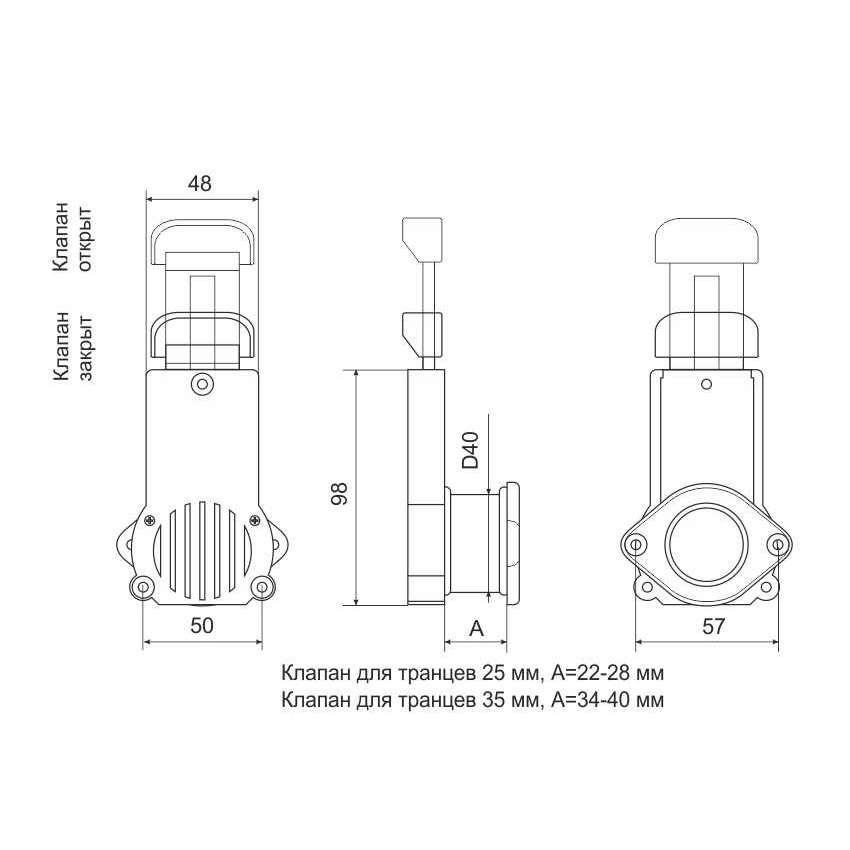 Современная модель сливного клапана с подвижной заслонкой, пришедшая на смену классическому клапану с конической, съемной пробкой снаружи транца лодки. Отличается от классического клапана тем, что для открытия клапана, необходимо просто поднять задвижку с внутренней стороны транца лодки. Для транцев толщиной 22-28 мм.