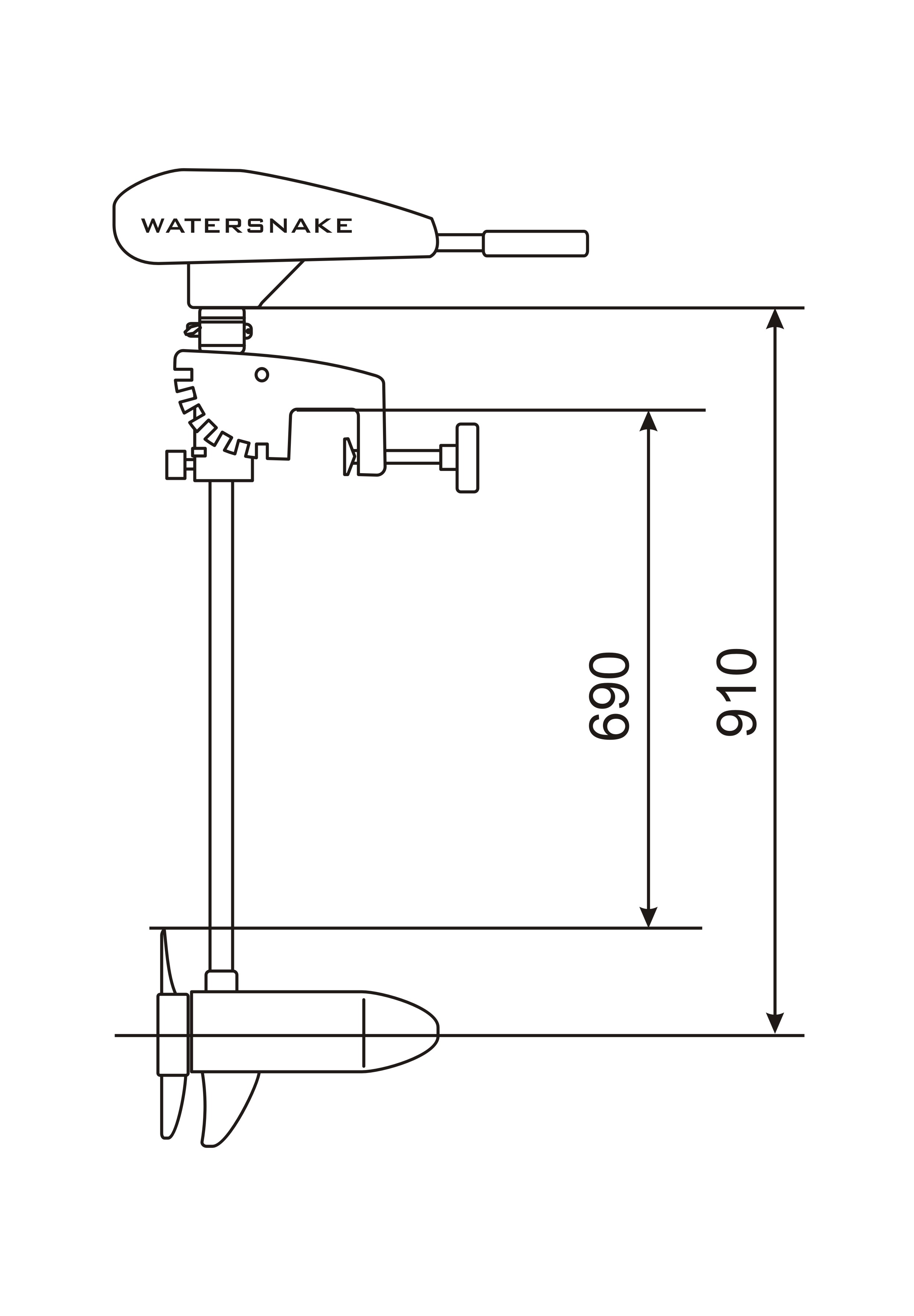 Румпель управления телескопический (13-28 см). Мотор имеет пять скоростей для движения вперёд и две для движения назад. Электрические провода оснащены концевыми клеммами под винт.
