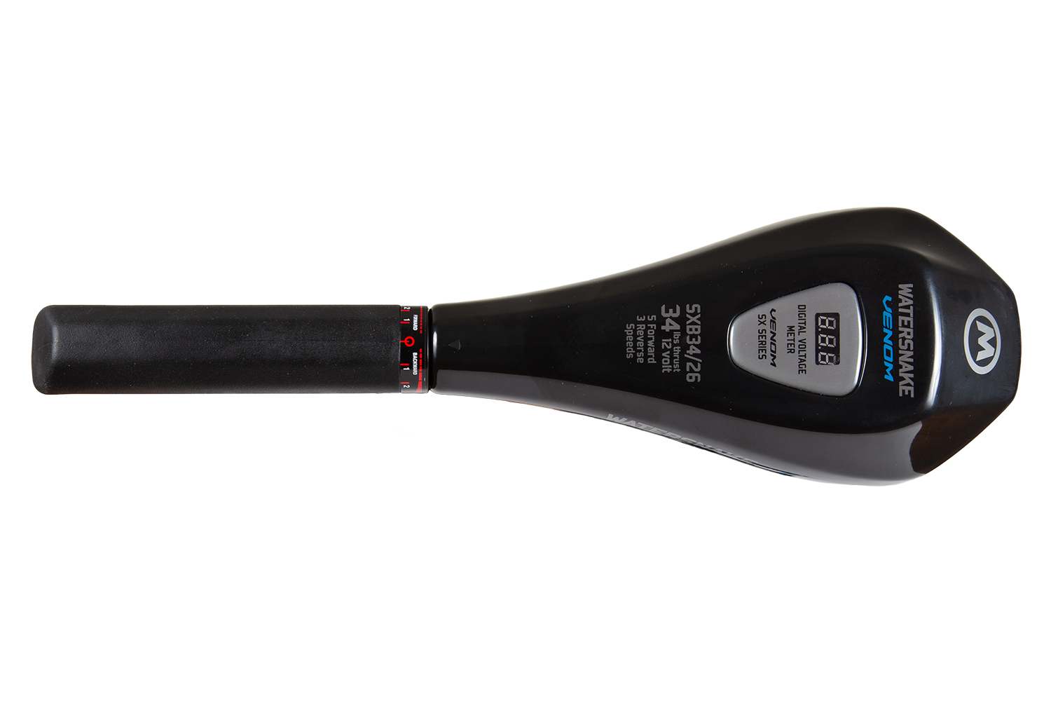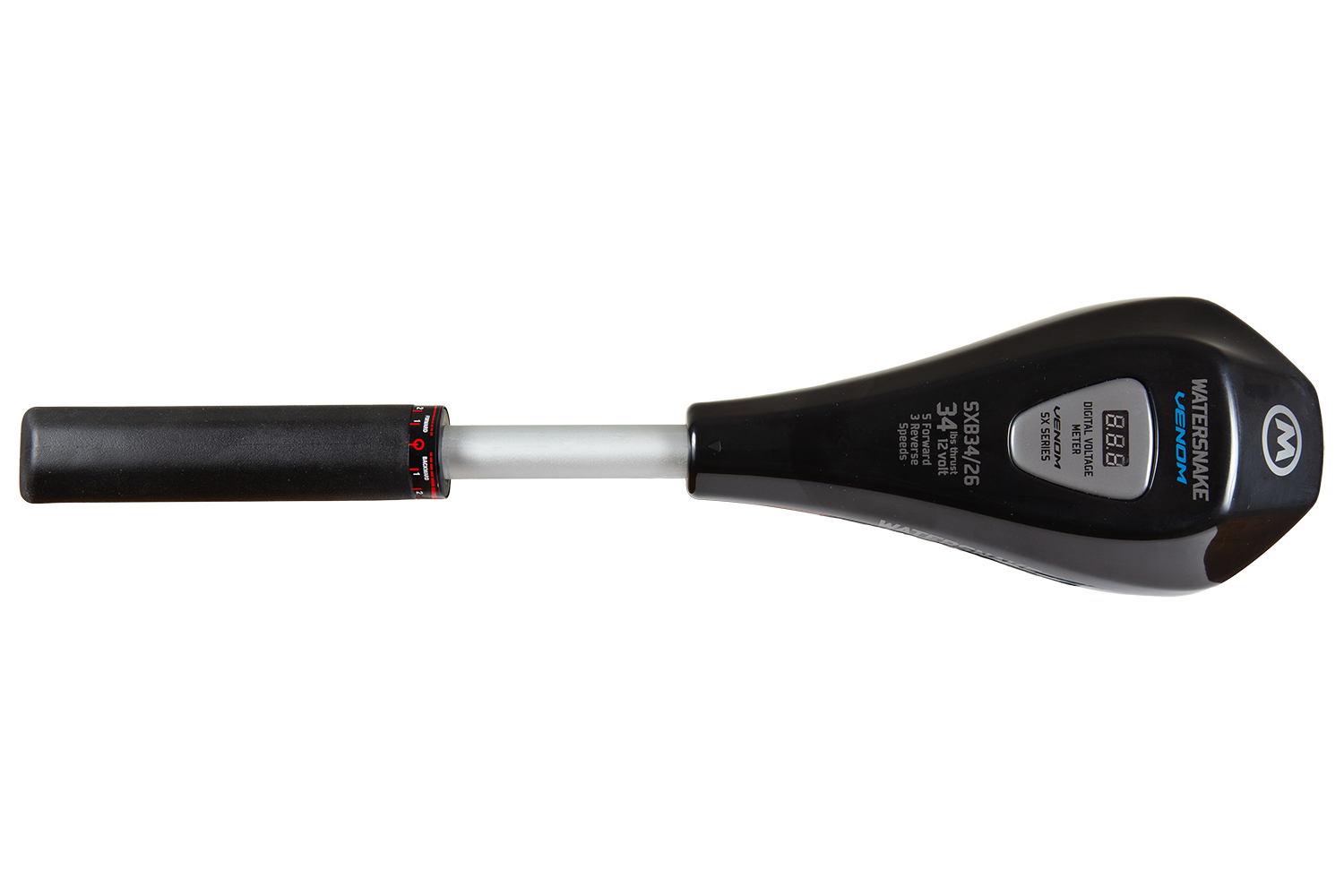 Румпель управления телескопический (13-28 см). Цифровой вольтметр на верхней панели позволяет контролировать уровень заряда батареи. Мотор имеет пять скоростей для движения вперёд и три для движения назад. Электрические провода оснащены зажимами типа «крокодил».