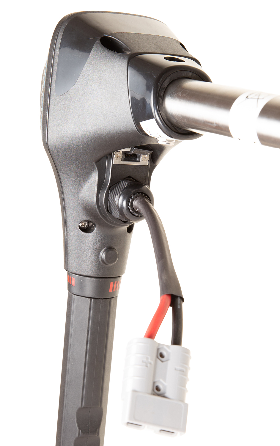 Румпель управления телескопический (13-28 см). Лодочный мотор имеет плавную регулировку скорости для движения вперёд и назад. В головной части мотора расположен USB разъем для зарядки гаджетов и цифровой вольтметр для контроля уровня заряда батареи. Электрические провода оснащены концевыми клеммами под винт и разъемом.