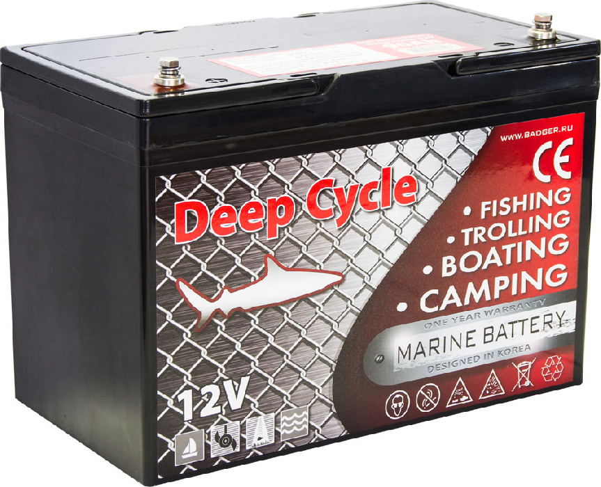 Герметизированный AGM аккумулятор 90Ah, средний по ёмкости среди тяговых. Универсален для питания лодочных электромоторов Watersnake в диапазоне мощностей от 34 до 44 фунтов тяги. Обладает высоким стартерным током (800А), что позволяет использовать его для запуска бензиновых ПЛМ.
