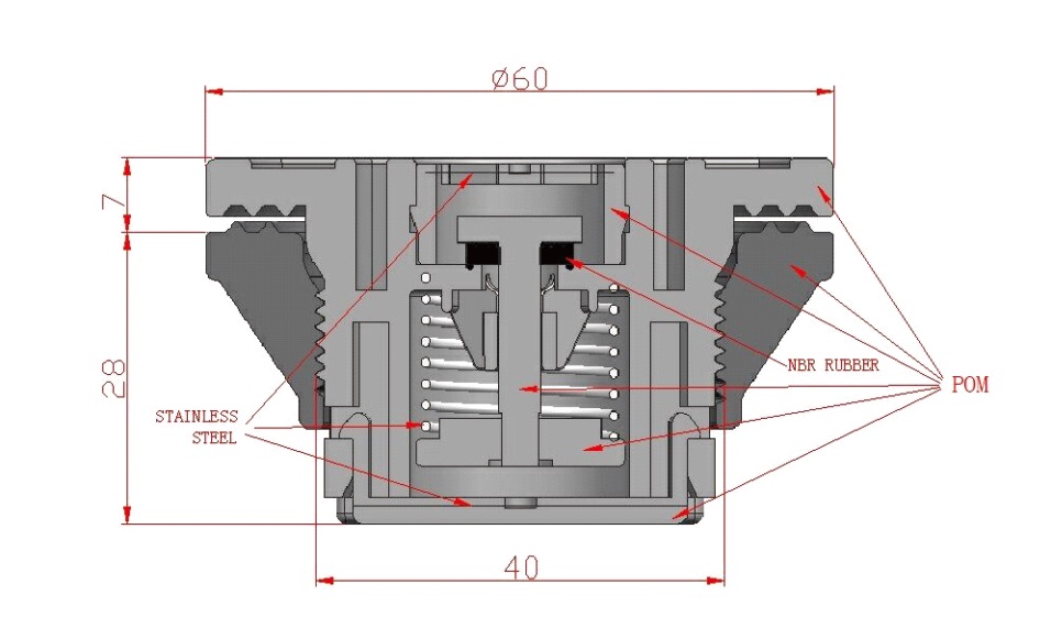 Тело клапана и ответная части изготовлены из инженерно – технического пластика с высокой прочностью POM (полиацеталь). Воздушные отверстия закрыты сеткой двойного плетения из нержавеющей стали 316. Для защиты клапана от внешних и внутренних загрязнений.