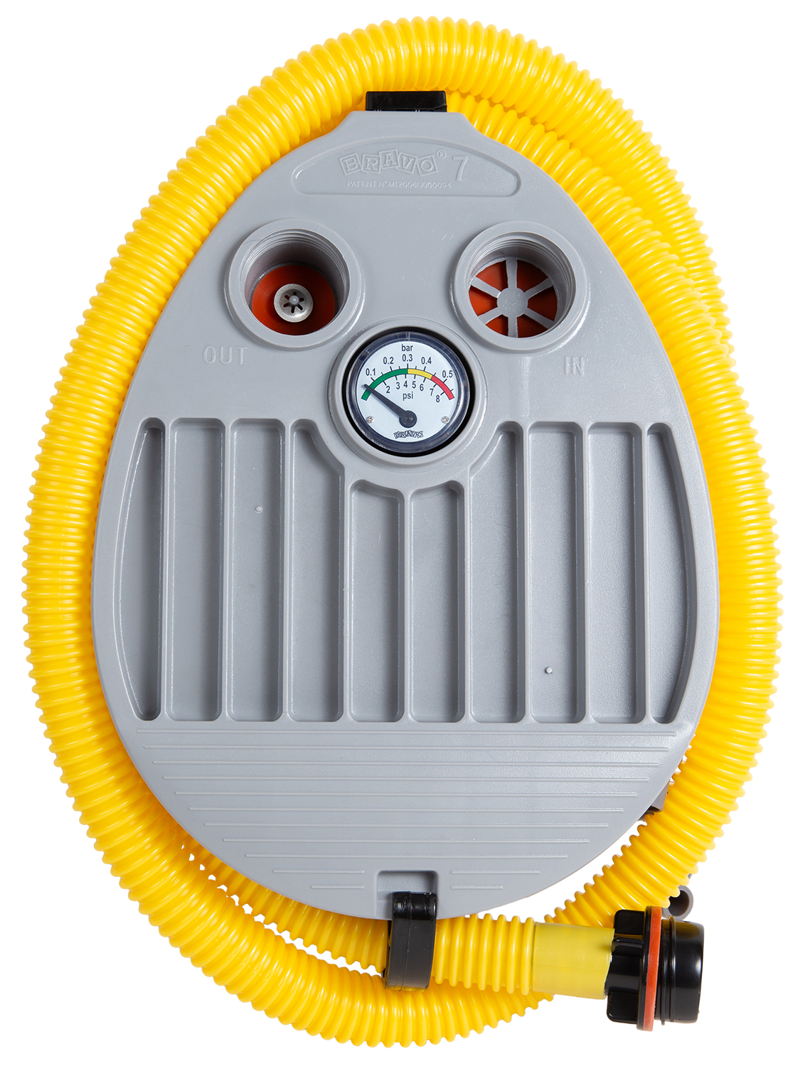 Насос ножной с манометром, профессиональной серии для надувных лодок и спасательных плотов. Опорные поверхности выполнены из полиамида, упрочненного стекловолокном, все металлические детали из нержавеющей стали.