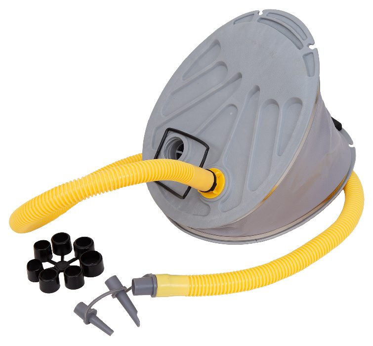 Модель ножного насоса для накачиваниянебольших надувных лодок и пляжных надувных аттракционов. Опорные поверхности изготовлены из упрочнённого пластика, шланг с увеличенной проходной способностью.