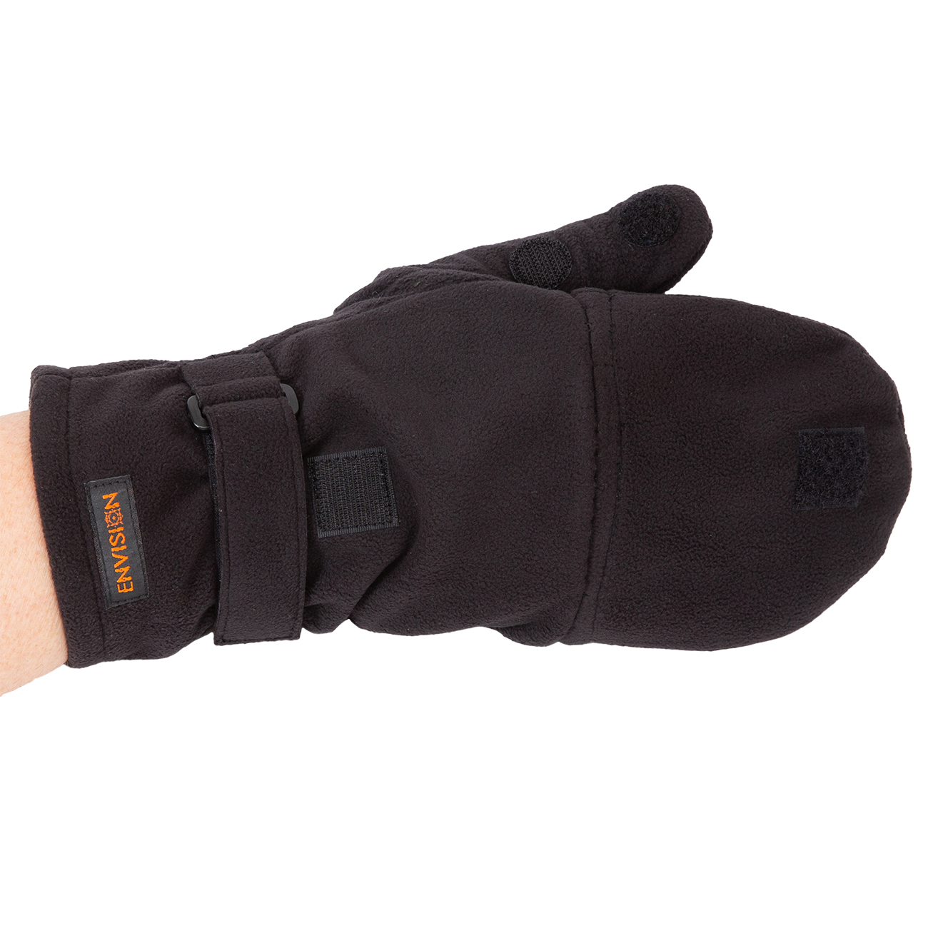 Такие перчатки варежки позволяют охотнику или рыболову работать как с закрытыми пальцами, так и открыть их для выполнения мелких работ, закрепив пальцевые "чехлы" на липучку. Перчатки с откидным верхом изготовлены из тёплого и мягкого на ощупь не продуваемого и водонепроницаемого материала DuPont Hytrel (100%). Для плотной фиксации на руке перчатки снабжены лентой на липучке в районе запястья. Наиболее эффективно использование данной модели в условиях ловли в холодную погоду по открытой воде (спиннинг, троллинг).