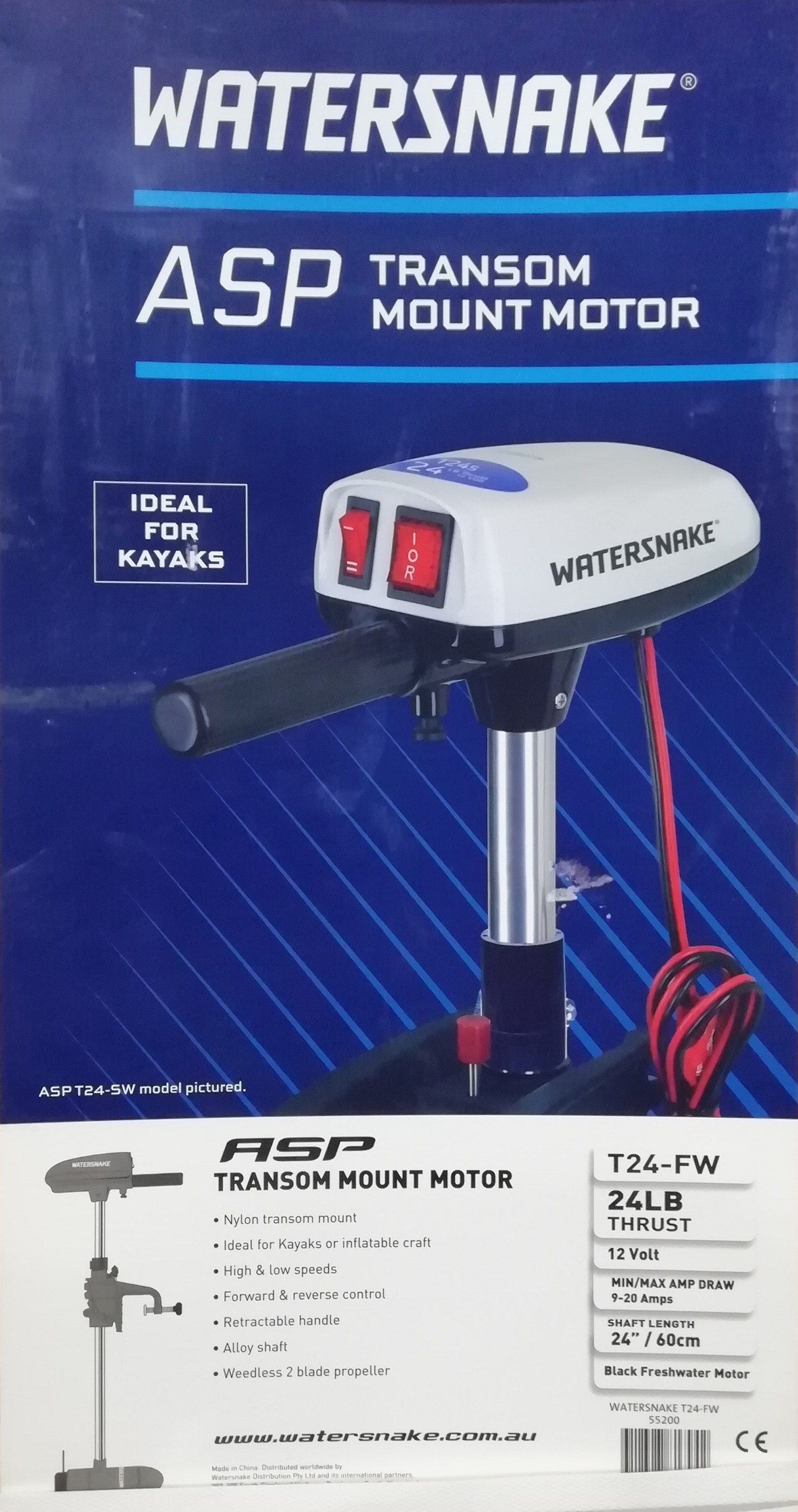 Румпель управления выдвигается из корпуса. Мотор имеет две скорости для движения вперёд и две для движения назад. Электрические провода оснащены зажимами типа «крокодил».