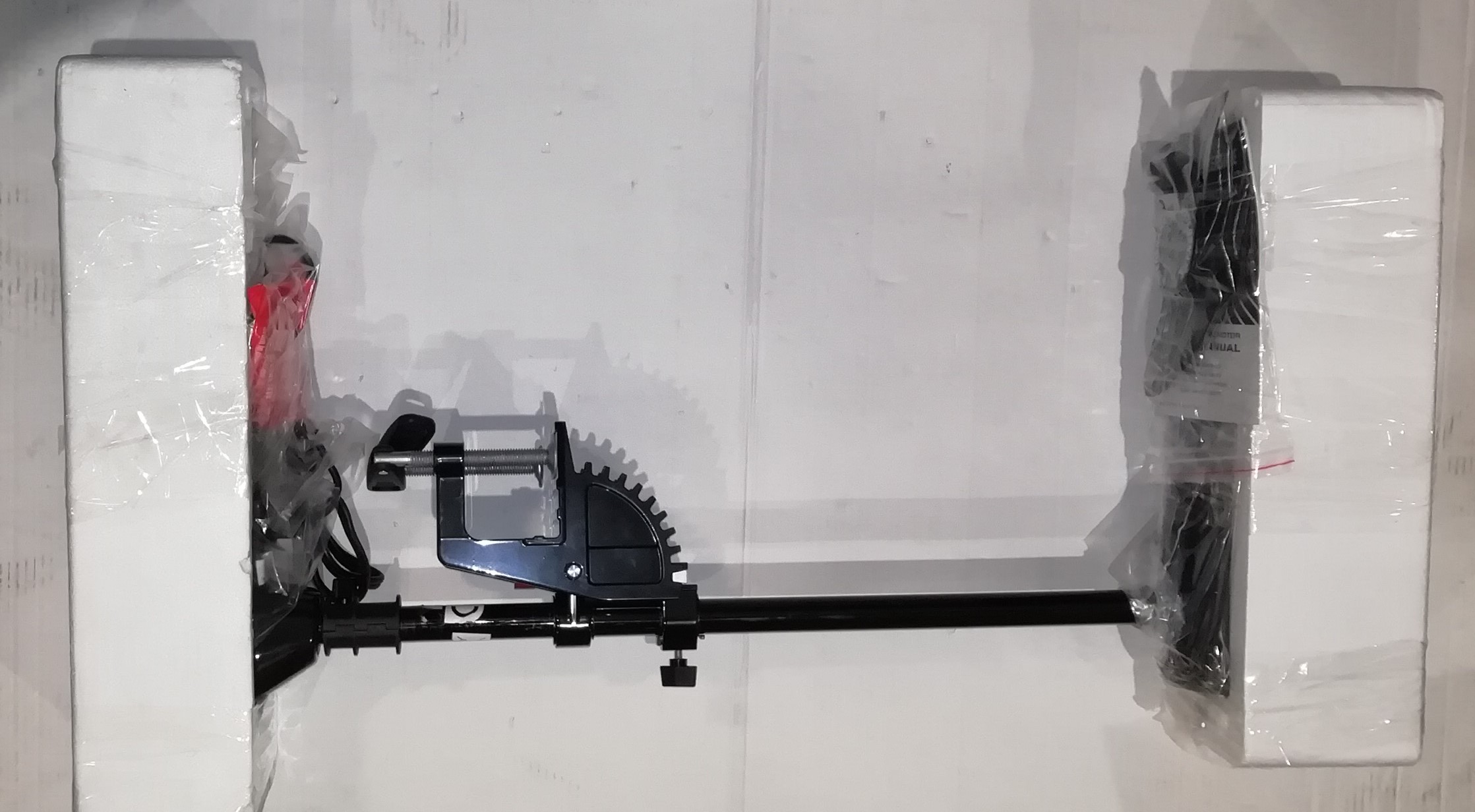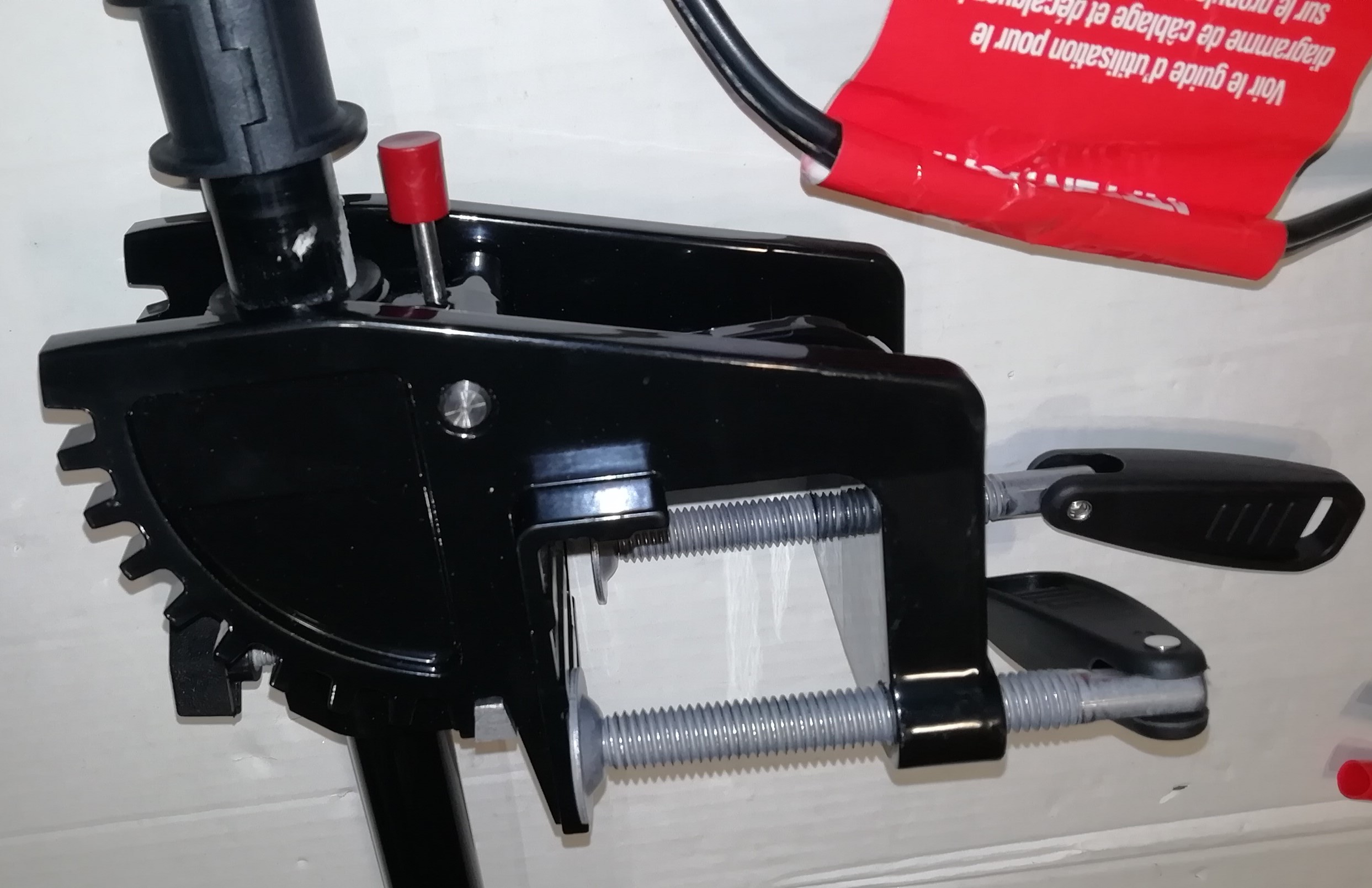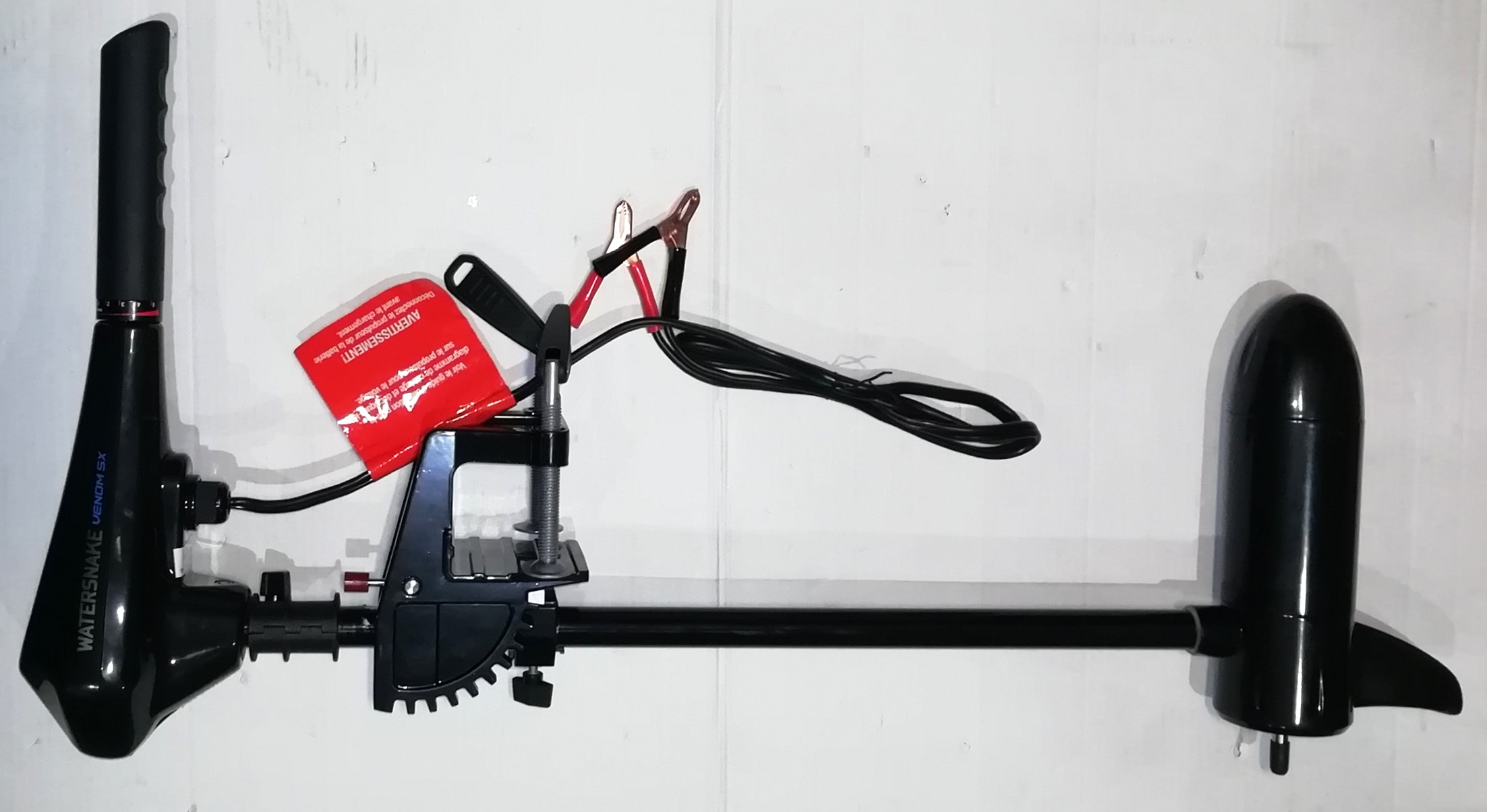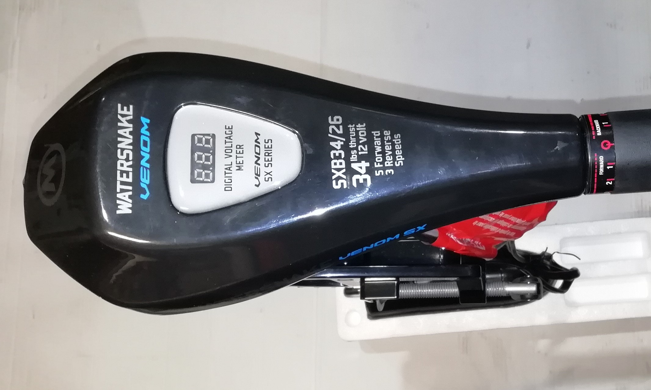 Румпель управления телескопический (13-28 см). Цифровой вольтметр на верхней панели позволяет контролировать уровень заряда батареи. Мотор имеет пять скоростей для движения вперёд и три для движения назад. Электрические провода оснащены зажимами типа «крокодил».