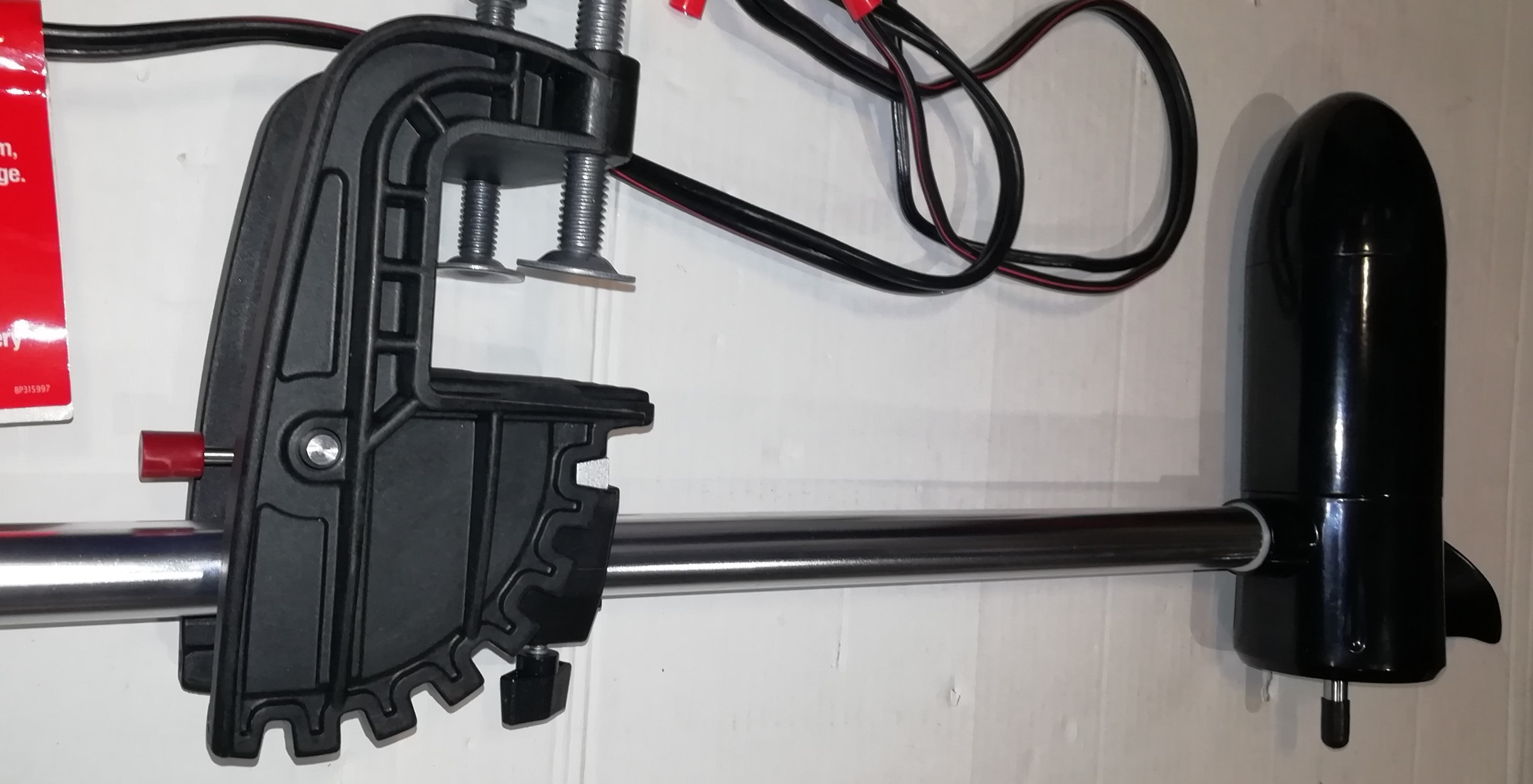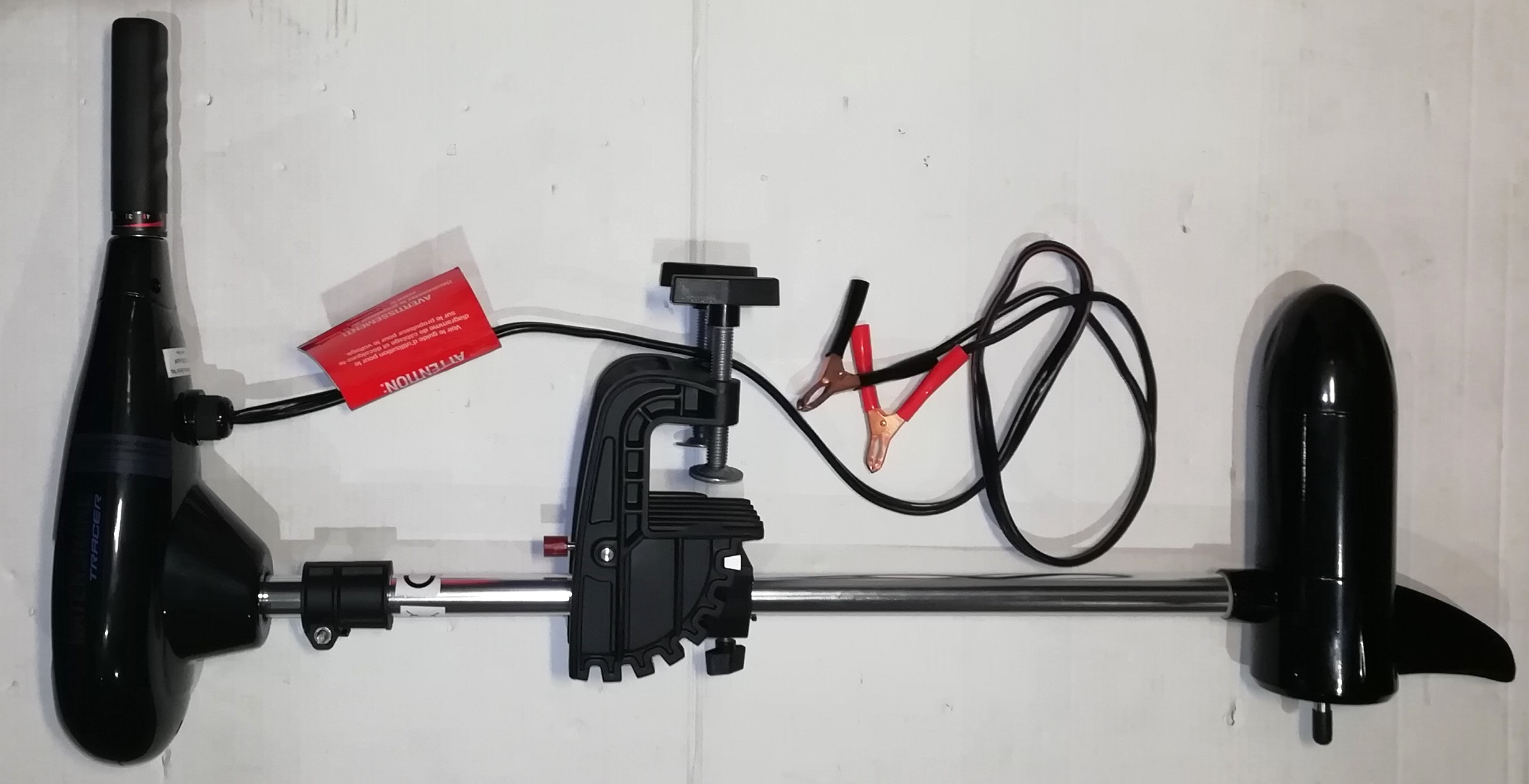 Румпель управления телескопический (13-28 см). Подвесной лодочный электромотор имеет пять скоростей для движения вперёд и две для движения назад. Электрические провода оснащены зажимами типа «крокодил».