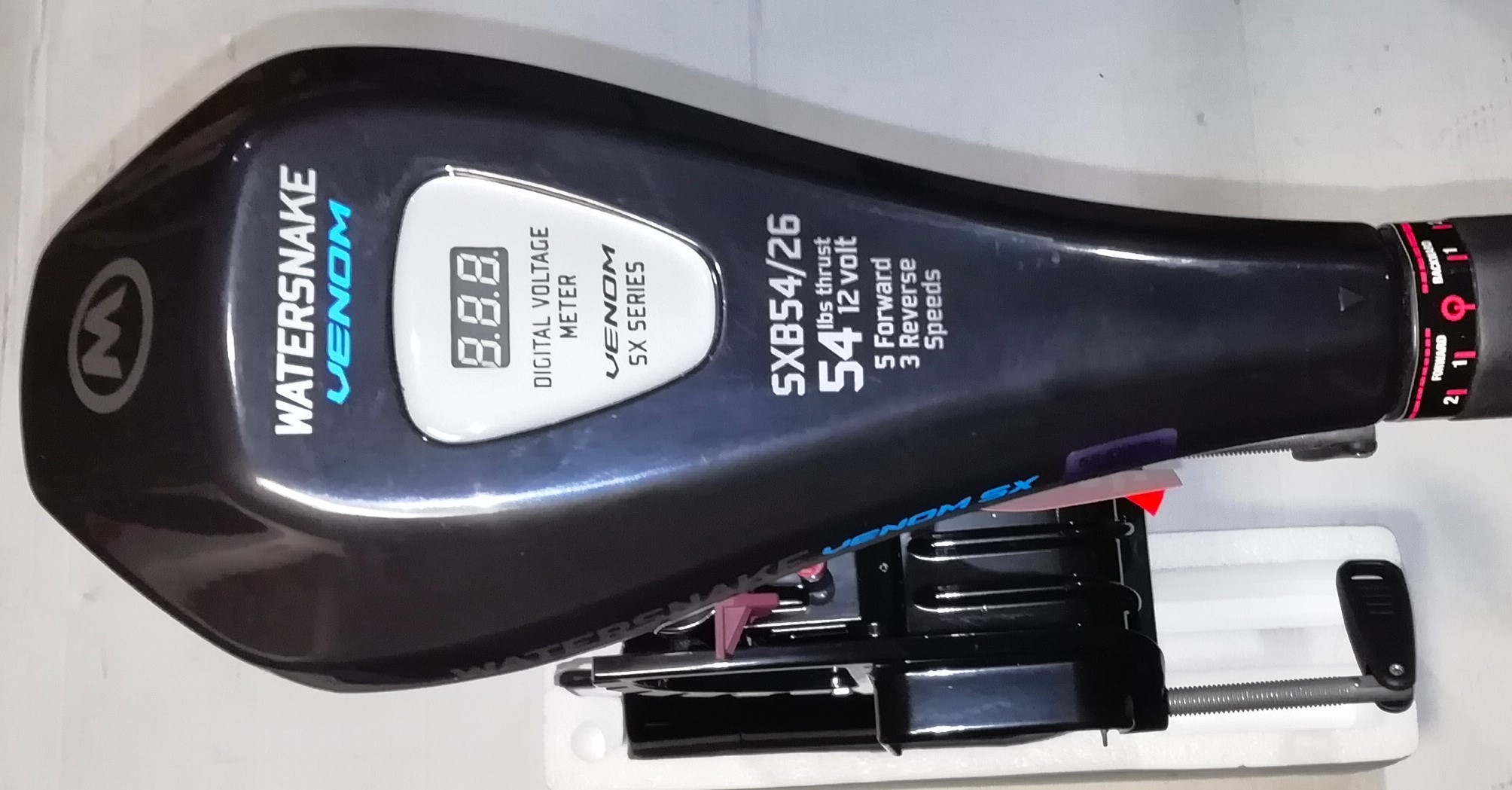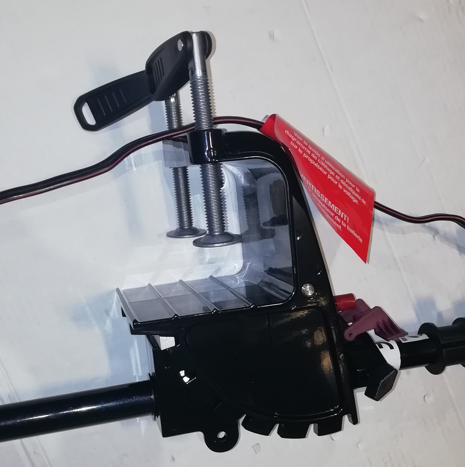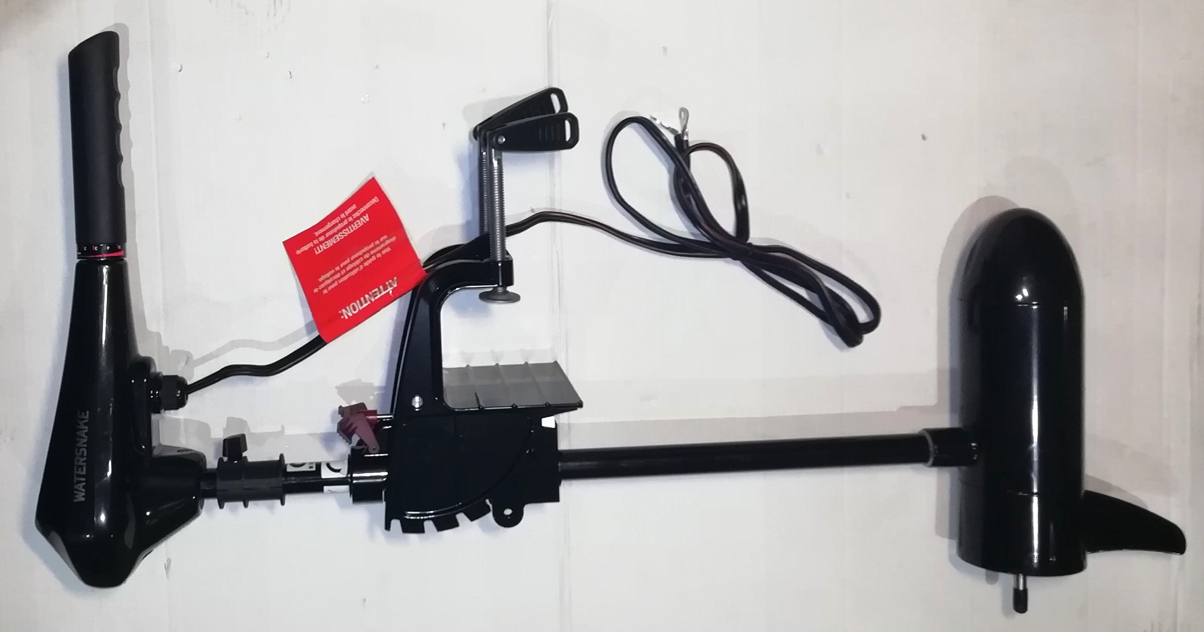 Румпель управления телескопический (13-28 см). Цифровой вольтметр на верхней панели позволяет контролировать уровень заряда батареи. Мотор имеет пять скоростей для движения вперёд и три для движения назад. Электрические провода оснащены концевыми клеммами под винт.