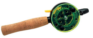 Катушка выполнена из флуоресцентно-зеленого ударопрочного пластика и хорошо заметна на снегу. Она снабжена мгновенным стопором хода шпули и позволяет очень точно отрегулировать отпуск лески и быстро изменить при необходимости горизонт ловли.