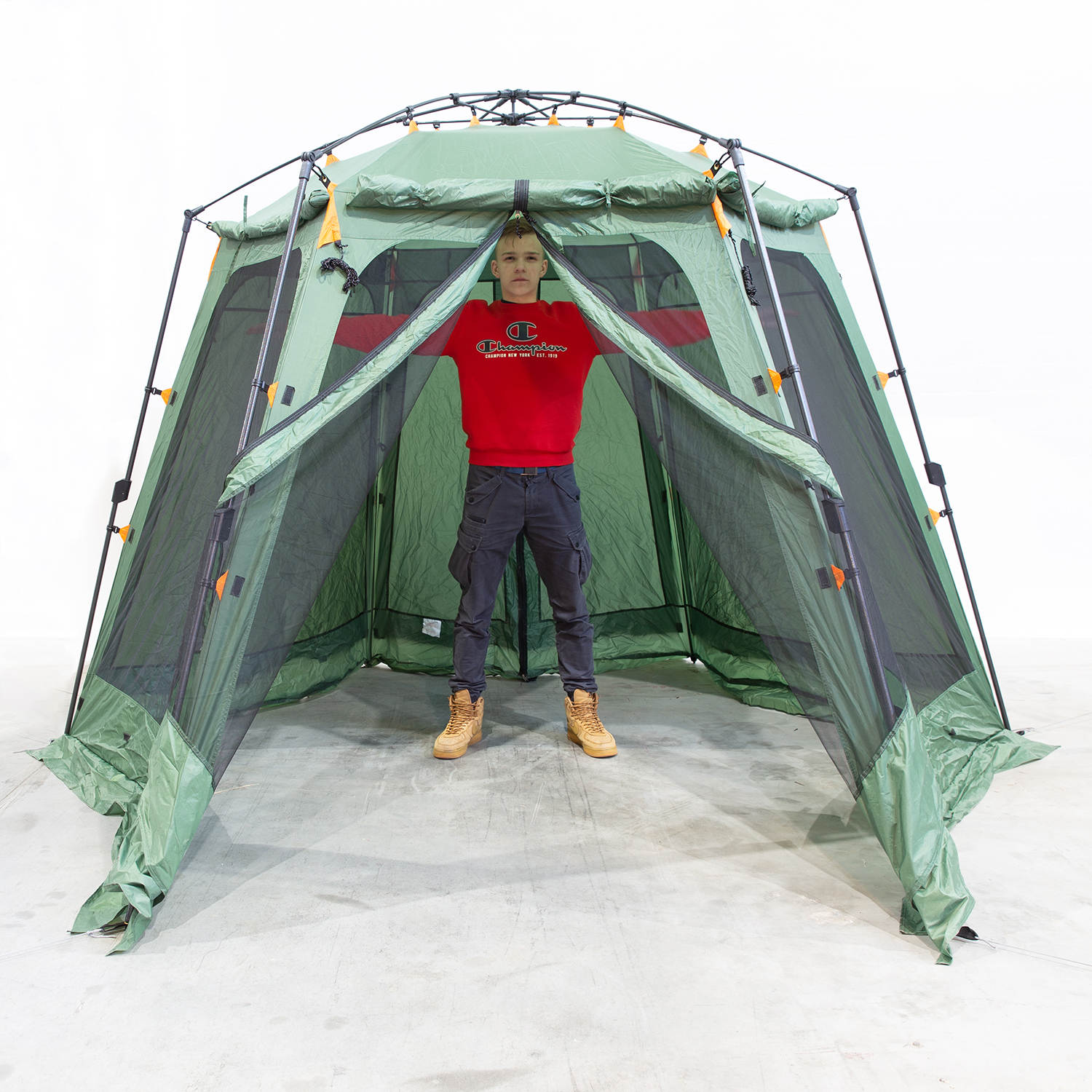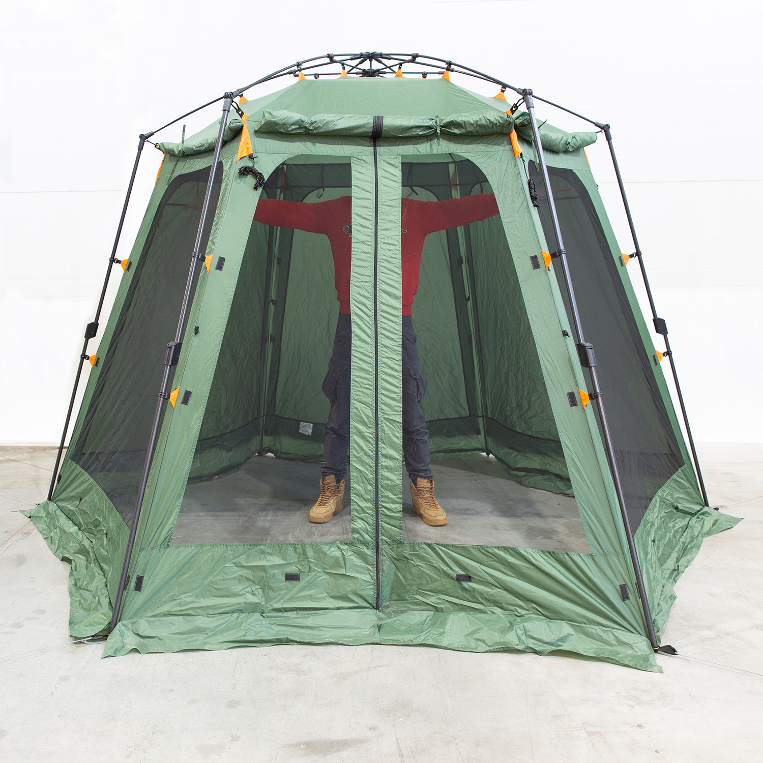 Тент для семейного отдыха с мощным алюминиевым каркасом, с системой быстрой сборки West House. Быстро устанавливается и собирается, защищает от солнца, небольшого дождя и, главное, от насекомых. Высота тента позволяет стоять в полный рост.