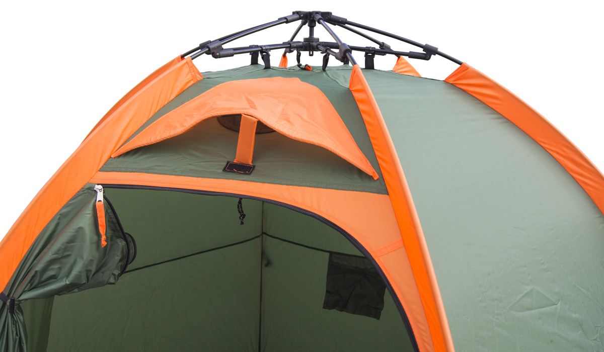 После сборки каркас этой 2-местной палатки автомат имеет основание в виде шестигранника, что делает такую конструкцию максимально устойчивой к порывам ветра. За счёт использования материалов светлых оттенков даже в зимний пасмурный день внутри светло. В конструкции данной быстросборной палатки предусмотрен функциональный регулируемый рукав для вентиляции и несколько удобных в использовании карманов для мелочей.