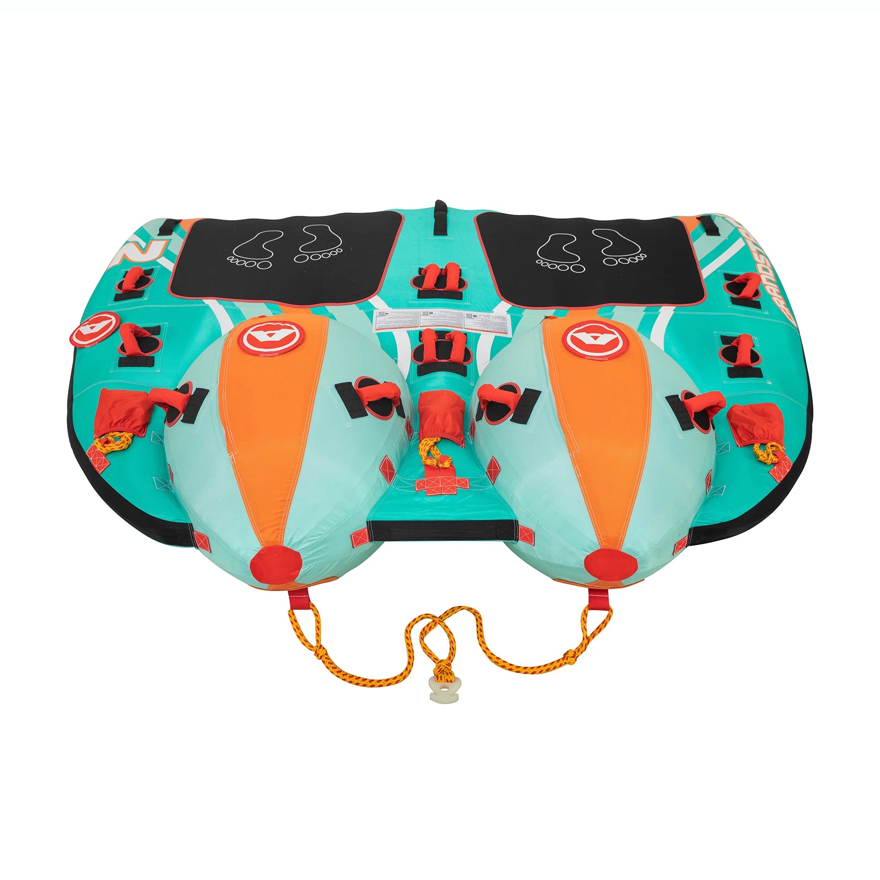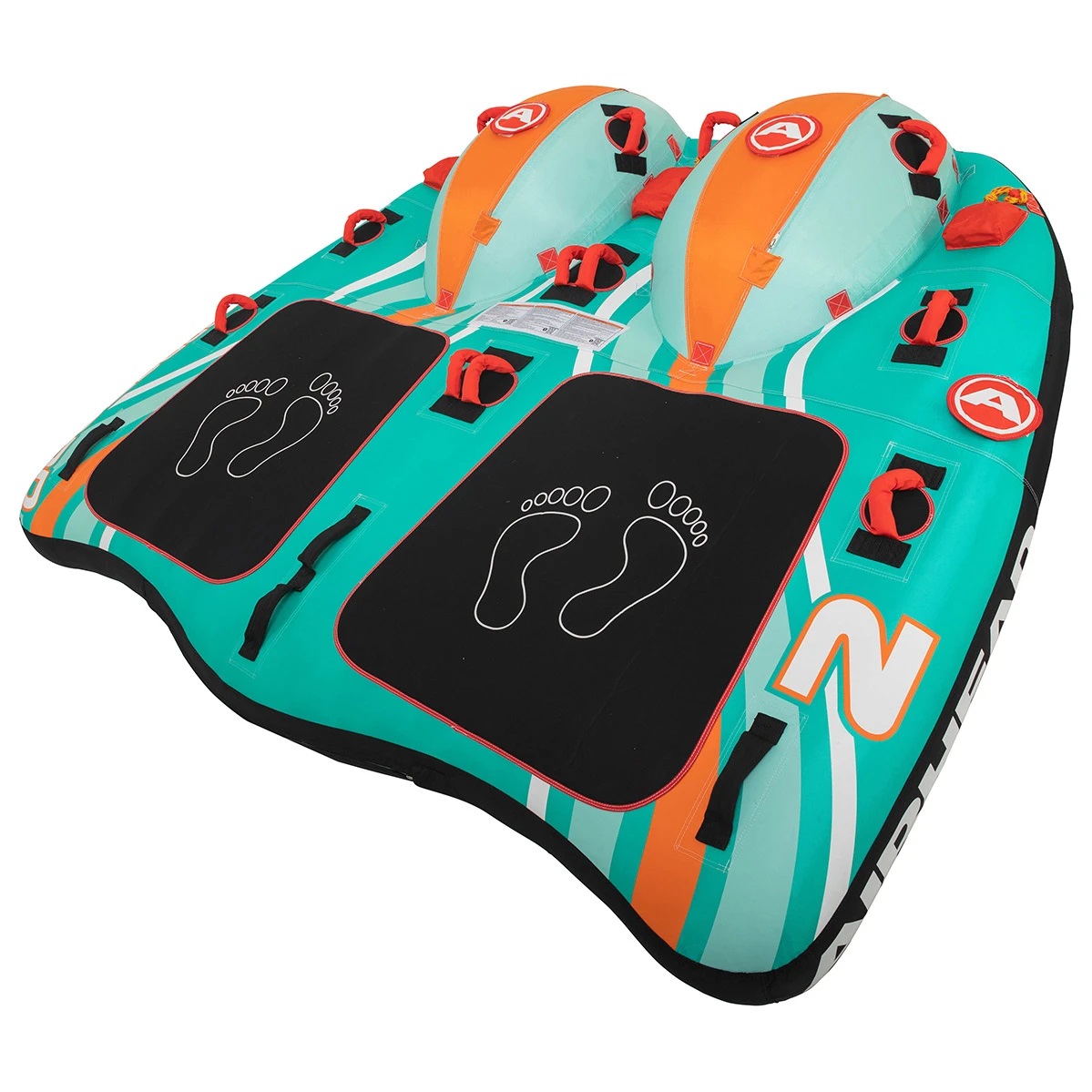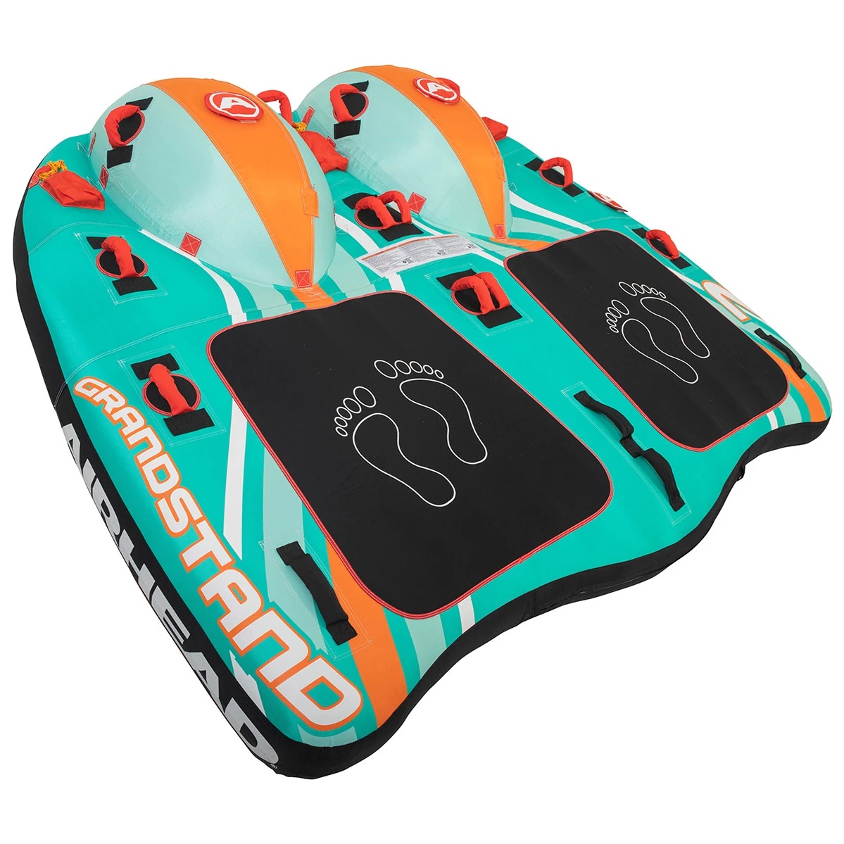 Устал сидеть? Встаньте и кричите вместе с новым GRANDSTAND 2! Этот единственный в своем роде буксируемый аттракцион для двух гонщиков имеет оригинальную конструкцию носовой части для легкой буксировки, и позволяет использовать несколько позиций для покатушек, включая возможность встать, как лыжник! Двойные поводки для рулевого управления и множество эксклюзивных ручек вселяют уверенность в том, что вы можете держаться в любом положении, находясь на воде, а яркая графика палубы дает знать, что вы идете! Встаньте вместе с новыми Granstand 2 от AIRHEAD! Размер в сдутом состоянии 264х224 см.