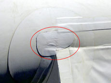 3) На мой взгляд, места крепления транца к баллонам со стороны днища нуждаются в дополнительном усилении. Этим летом я обнаружил там критичные потертости с обеих сторон. Воспользовавшись ремкомплектом, сделал усиливающие наклейки (см. фото).