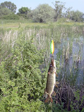 Следующий тест был проведён в дельте Волги на базе «Взморье» 26.06-1.07. Выходим на раскаты, нахожу место с глубиной около метра. На дне – ковёр растительности. Работают в основном поверхностные приманки (попперы, уокеры, баззбейты и др.) Ловится некрупная щучка 1-2 кг.