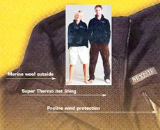 Термобелье Brynje двухслойно: внутренний слой выполнен из синтетического текстиля Meraklon Super Thermo net fabric, комфортного и не вызывающего раздражения кожи при ношении прямо на тело и обладающего прекрасными дышащими свойствами; наружный слой – шерстяной. Его основа – натуральная длинноволоконная шерсть овец-мериносов.